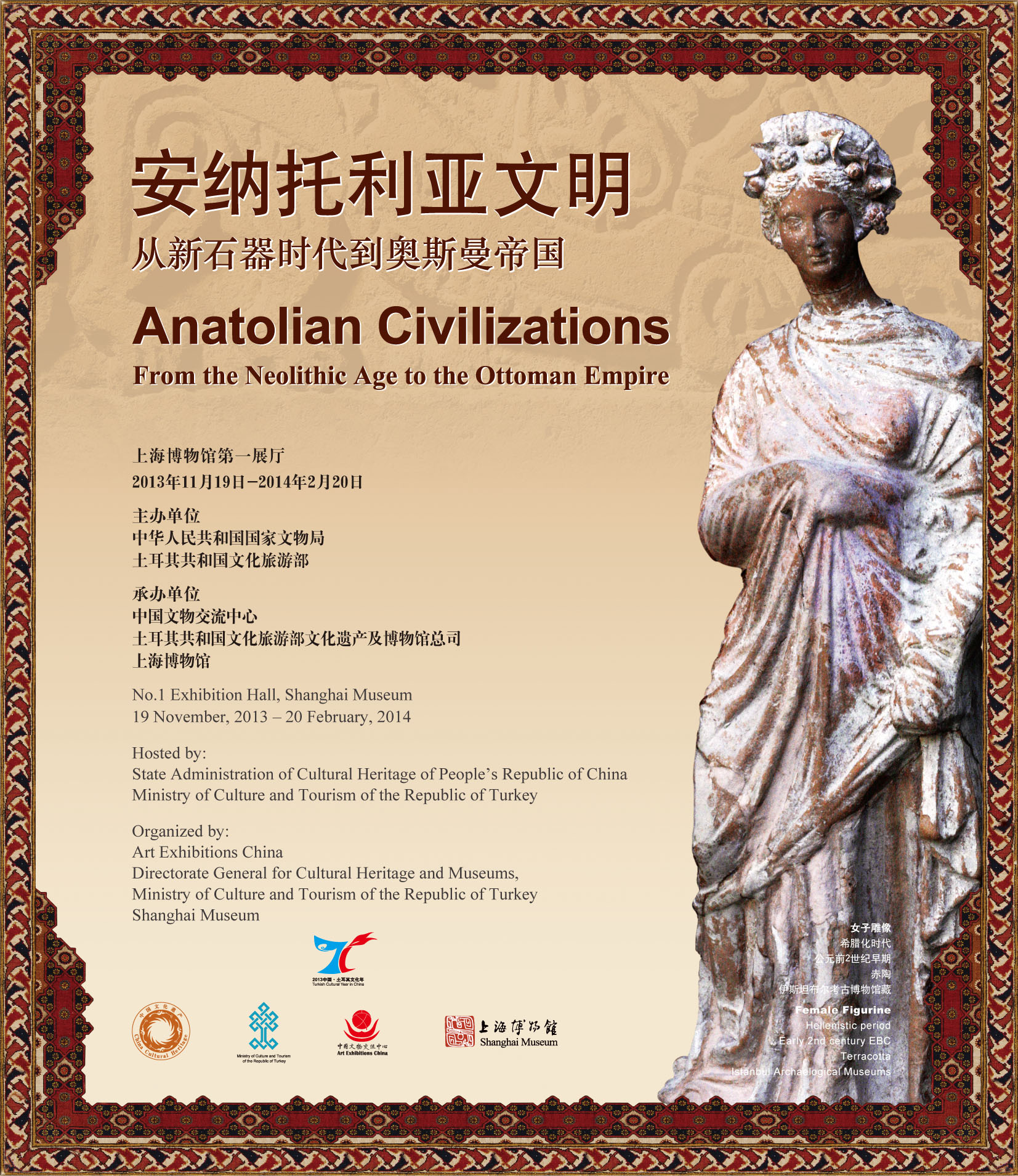 “安纳托利亚文明:从新石器时代到奥斯曼帝国”展是“2013中国土耳其文化年”系列活动中的一项重要内容。本次展览展品共计122件,是从伊斯坦布尔考古博物馆、托普卡帕老皇宫博物馆和土耳其及伊斯兰艺术博物馆挑选出来的精品文物,年代跨度从新石器时代一直到奥斯曼帝国末期。