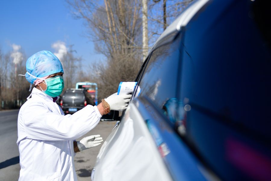Uma funcionária mede temperaturas de passageiros em um ponto de controle rodoviário no distrito autônomo de Hui-Tu de Datong, Xining, na província noroeste chinesa de Qinghai, em 29 de janeiro de 2020. Diversas medidas são tomadas através da China para combater o novo coronavírus.